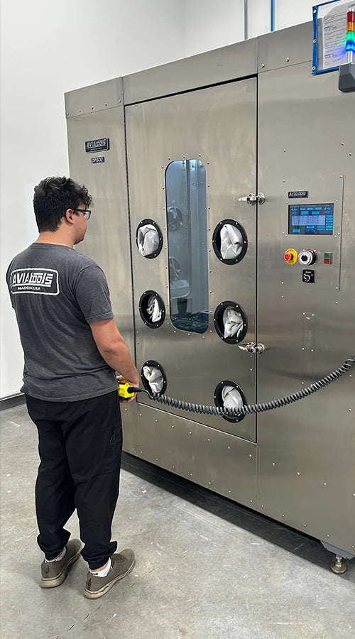 AviaTools revolutionizes the De-Powdering process by efficiently extracting unsintered powder from 3D-printed parts. Our innovative machines, available in various sizes, feature an optional atmospherically controlled cabin for optimal results. They can be operated manually or through CNC (programmable) controls, ensuring precision and flexibility. Contact us today for more information.